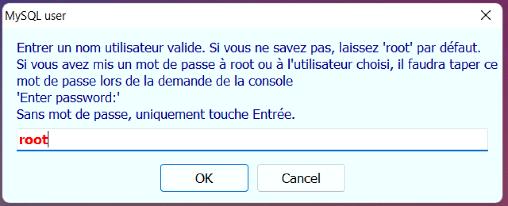 Le système vous demandera ensuite d'entrer votre nom d'utilisateur MySQL