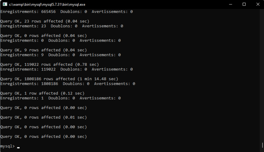 Voilà, l'import est parti, MySql va maintenant importer les données dans votre base par batches. Pour ma part, cette partie a durée environ 5 minutes - très rapide donc.